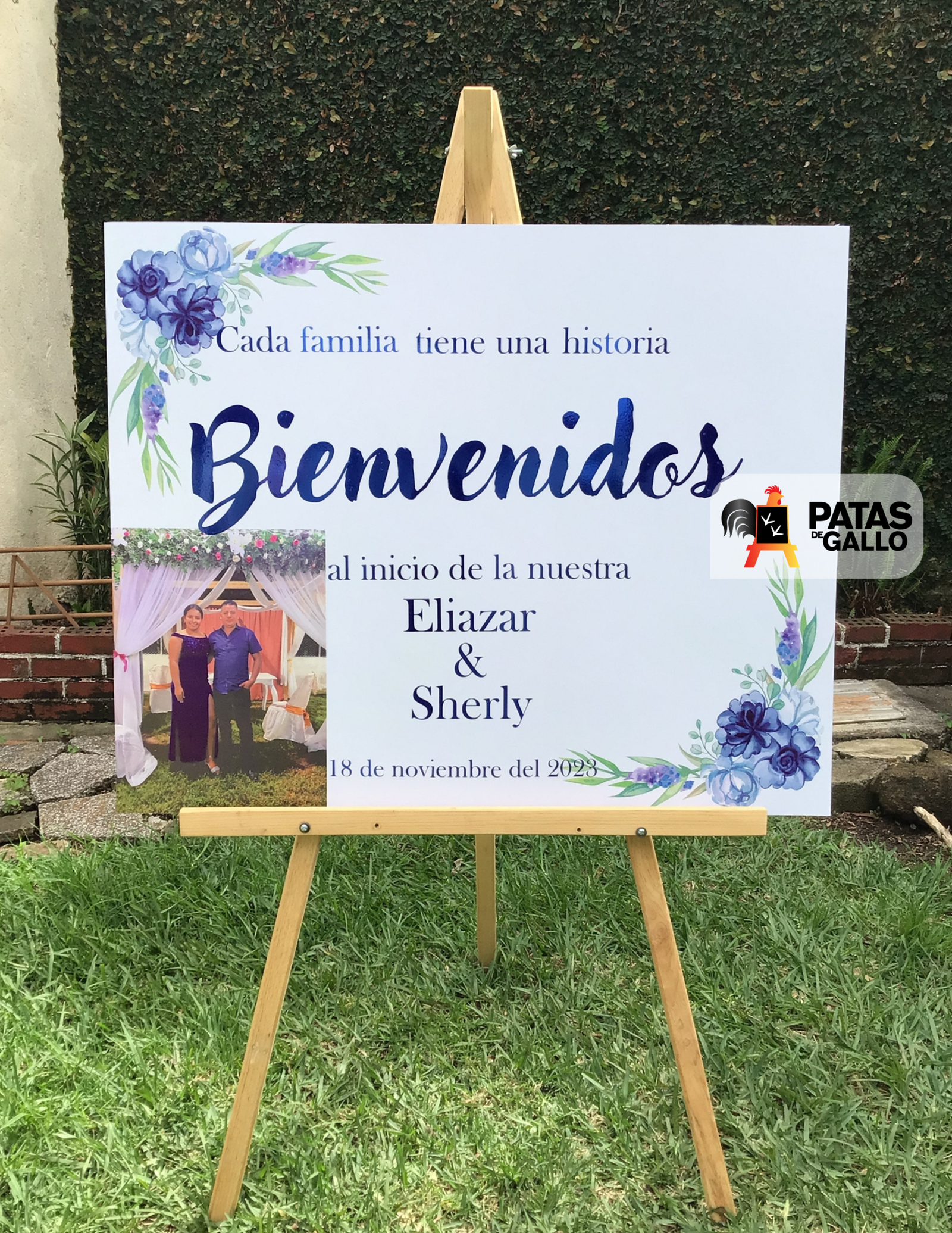 Rótulo de bienvenida diseñado especialmente para bodas, con estilo floral y fotografía personalizada.